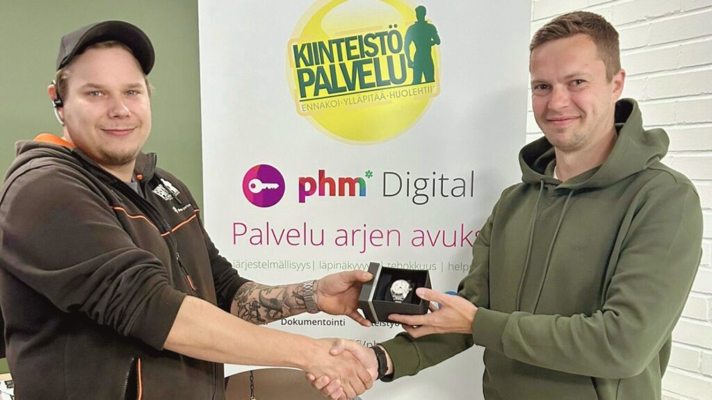 Kuvassa PHM Groupin operatiivinen johtaja Juho Koskimies (oikealla) onnittelee Toni Kauppista.
