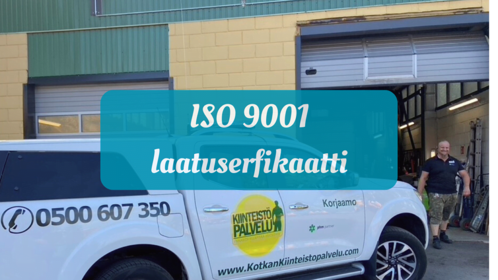 Laatujärjestelmäsertifikaatin avulla yritys voi osoittaa, että sen toiminnan tasoa seurataan säännöllisesti ja että sen toiminnan on todettu olevan standardin vaatimusten mukaista. ISO 9001 on maailman tunnetuin standardi ja käytetyin johtamismalli, joka perustuu jatkuvan parantamisen filosofiaan. ISO 9001 standardi toimii työkaluna liiketoiminnan, prosessien ja johtamisen kehittämisessä. Alunperin sertifikaatti myönnettiin Kotkan Kiinteistöpalvelulle vuonna 2015.
